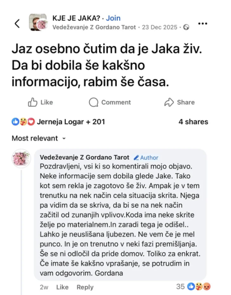 V zadnjih dneh je na družbenem omrežju Facebook o primeru spregovorila tudi vedeževalka Gordana. V pogovoru za portal je poudarila, da ne navaja dejstev ali preverljivih informacij, temveč osebne zaznave, ki jih prejema skozi vedeževanje. Po njenih besedah ima močan občutek, da je Jaka še vedno živ, pri zaznavah pa naj bi se opirala na jasnočutnost, jasnoslišnost in jasnovidnost.